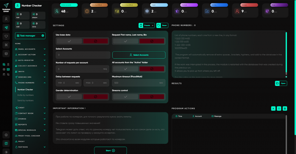 У Telegram Expert робота з номерами побудована як окремий напрям: ви не просто використовуєте базу — ви приводите її в робочий стан.