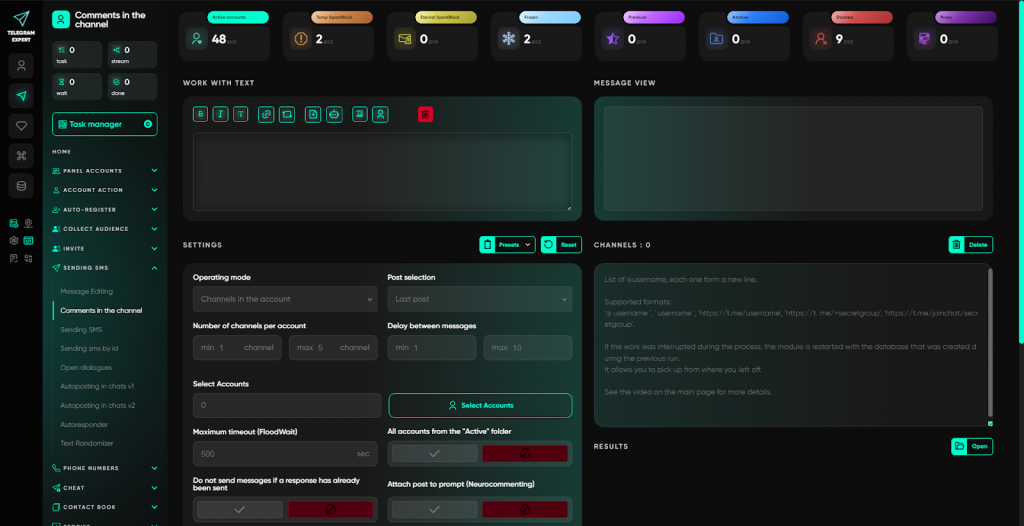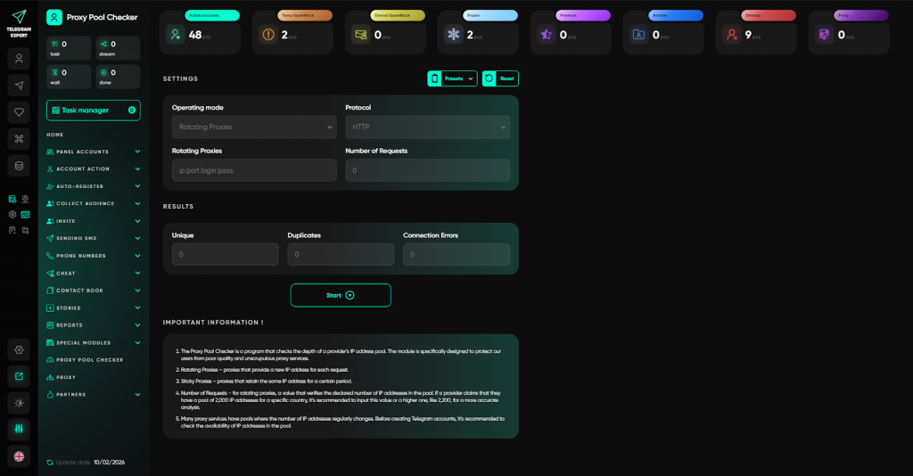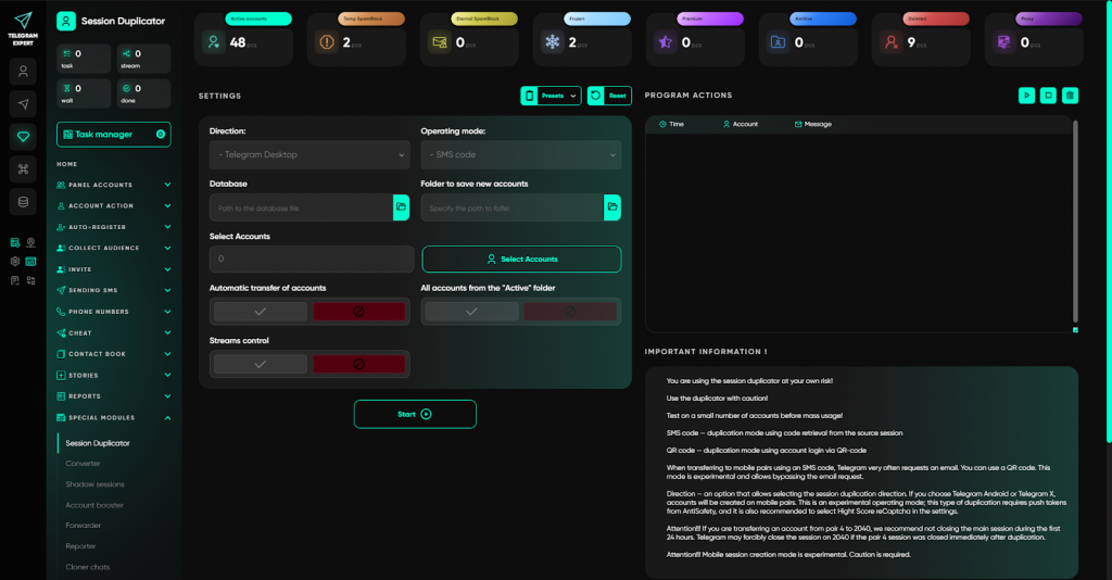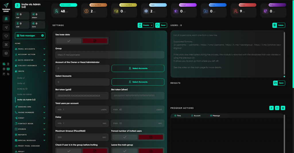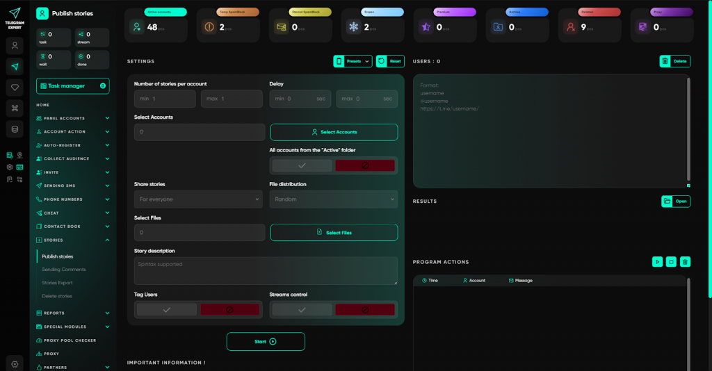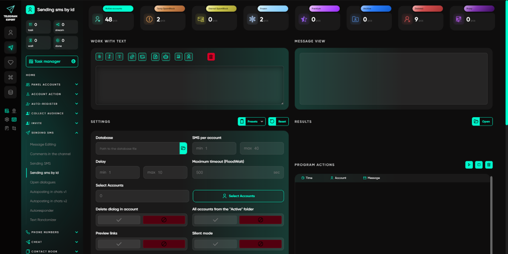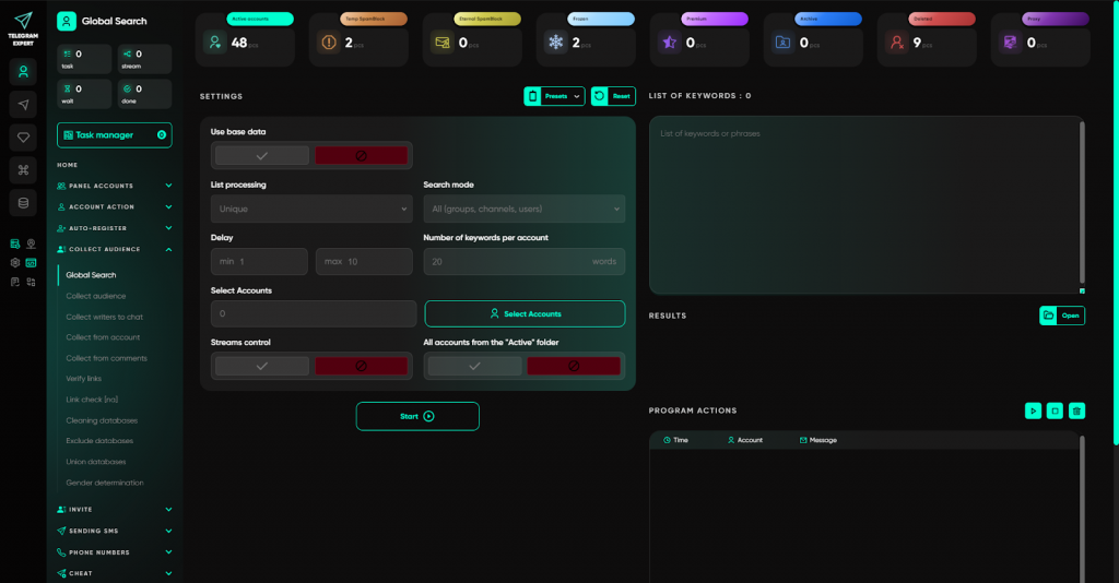Саме для цього і був створений Telegram Expert — не як софт для розсилок, а як професійна екосистема, що охоплює весь цикл роботи: від реєстрації акаунтів до аналітики та масштабування.