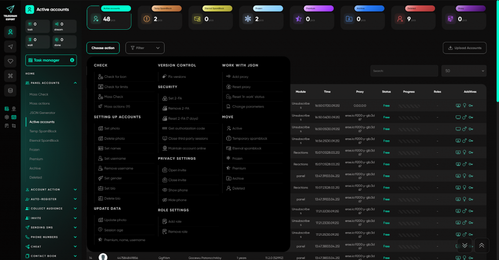 Папки акаунтів і меню дій — кожна група має єдине меню швидких дій: можна вибрати окремі акаунти або всю папку і одразу запустити потрібні операції без переходу між розділами. Доступні дії з акаунтами: перевірка банів та обмежень, встановлення/видалення фото, імені, username та bio, встановлення і скидання 2FA, встановлення статі, підтримання онлайн-статусу, закриття сторонніх сесій, налаштування приватності, додавання/скидання проксі, переміщення між папками, оновлення даних (вік, статус Premium), самознищення акаунта, видалення сесій і повідомлень та багато іншого.