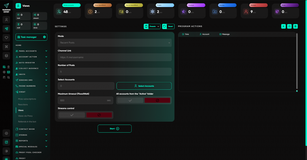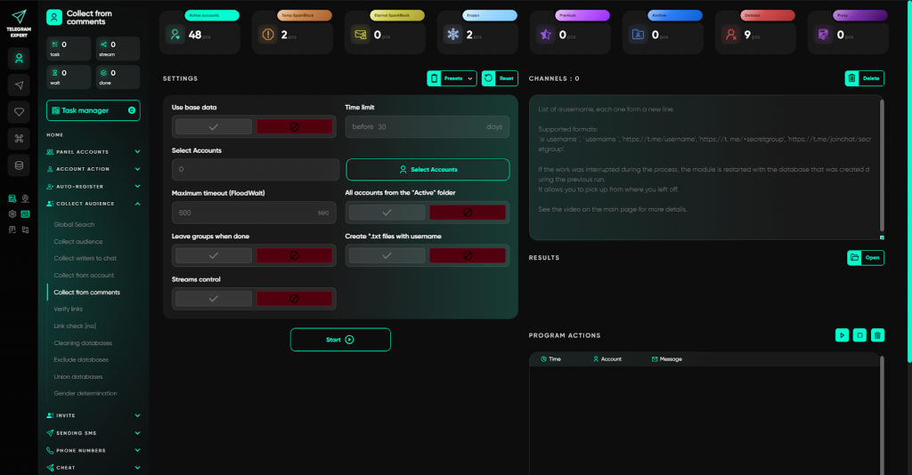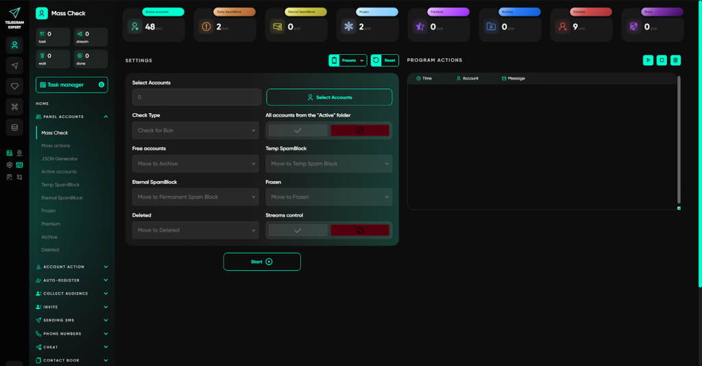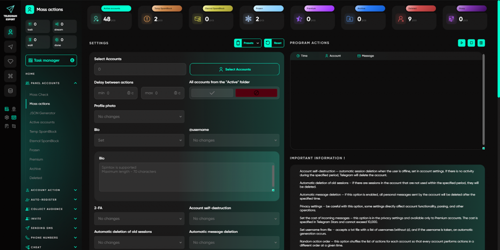 У Telegram Expert сервісні завдання винесені в окремий розділ і виконуються централізовано, без ручного втручання в кожен акаунт. Користувач запускає потрібні операції масово та контролює процес з одного вікна.