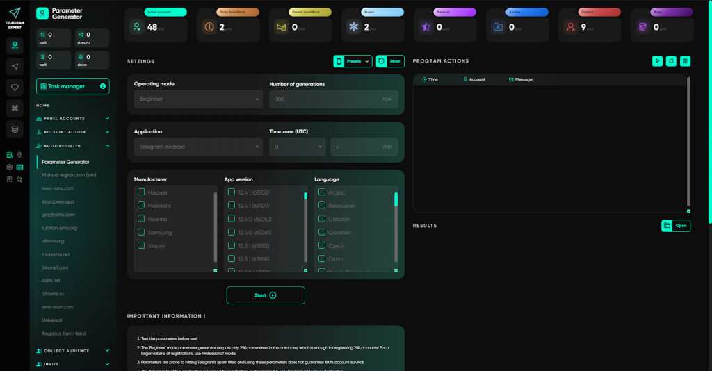 - Manual registration — реєстрація акаунтів через фізичні SIM-карти з емуляцією мобільного пристрою та параметрами з генератора.