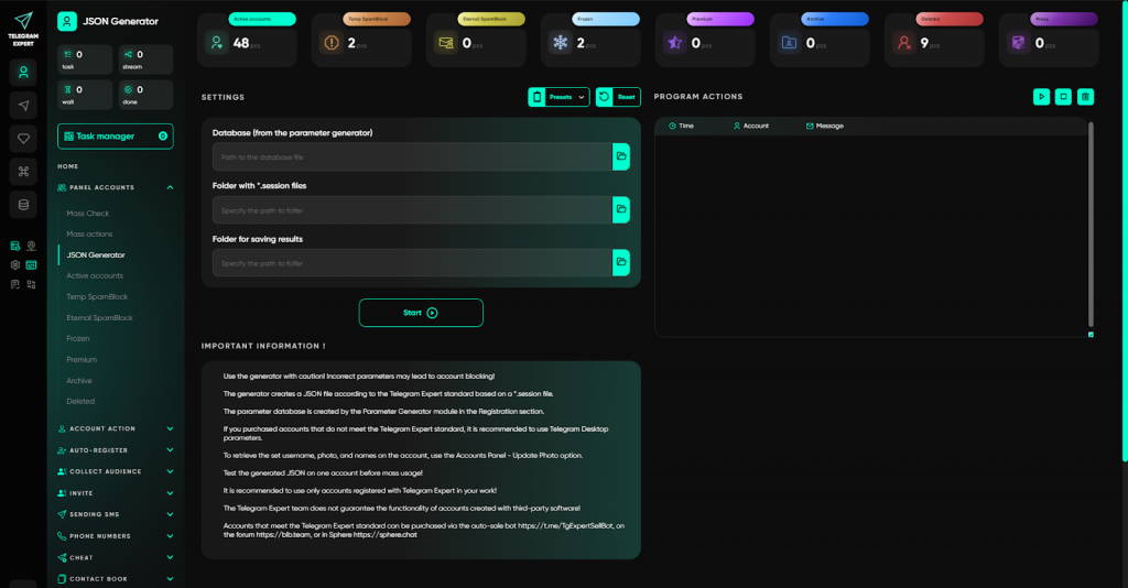 JSON Generator — дозволяє створити або відновити JSON-файл із Session, якщо дані відсутні або пошкоджені, і повернути акаунт у повноцінну роботу.