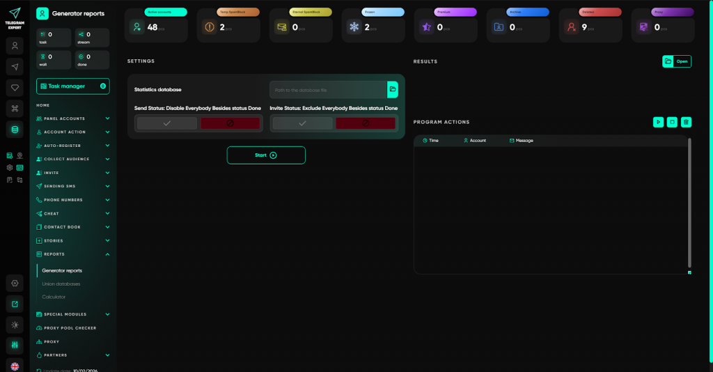 - Report Generator — формування підсумкових даних щодо розсилок і інвайтів на основі статистики софту. Ви бачите, скільки повідомлень доставлено, скільки користувачів додано і які акаунти працювали без помилок.