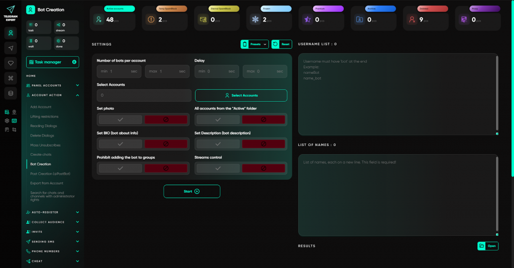 - Entity creation — запуск створення чатів, каналів, постів і ботів одразу на вибраних акаунтах.
