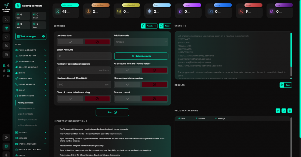 Робота з контактами в Telegram часто випадає з автоматизації. Додавання номерів по одному, ручне видалення, неможливість синхронізувати адресні книги між акаунтами — усе це створює хаос і заважає використовувати контакти для безпечніших розсилок та інвайтів.