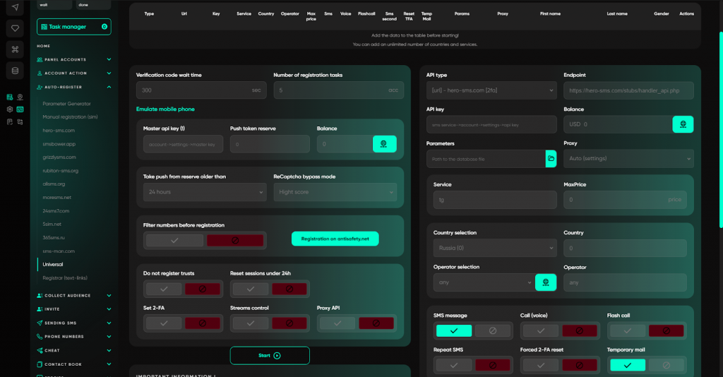 - Registration via SMS services — автоматична масова реєстрація через інтегрованих SMS-провайдерів із підтримкою різних сценаріїв отримання коду.