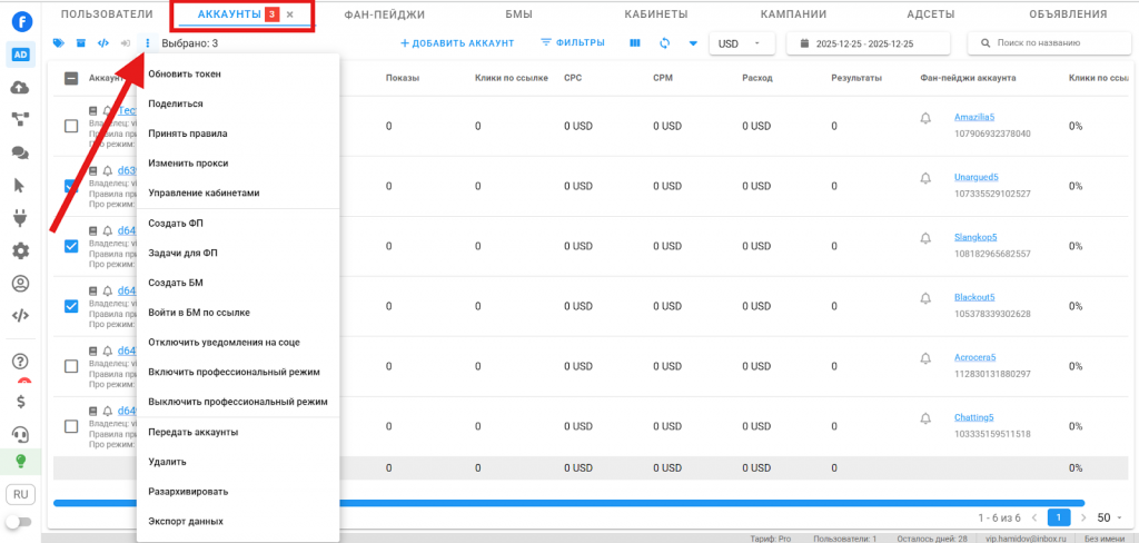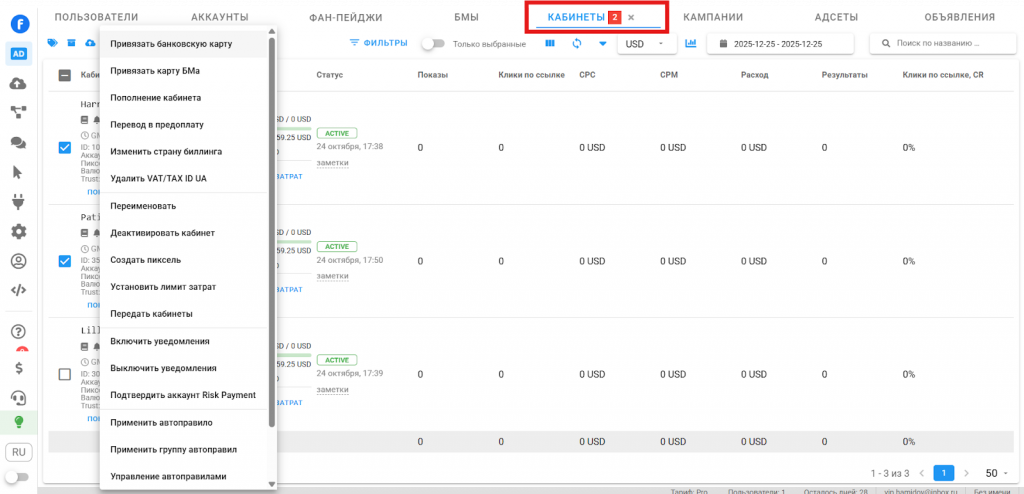 Практически все эти действия производят через вкладки «Аккаунты» и «Кабинеты». Для их совершения достаточно выделить нужные объекты и открыть список доступных операций.