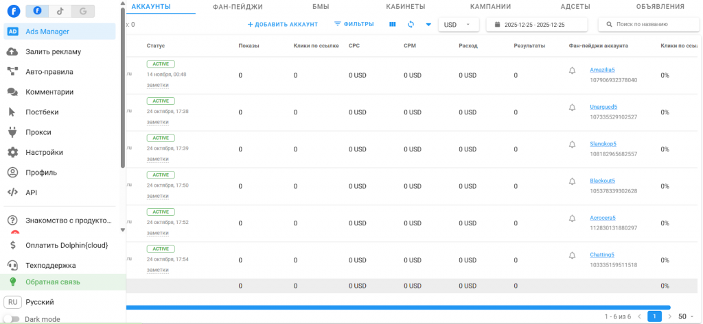 При входе в аккаунт автозалива открывается Dolphin Cloud открывается Ads Manager — раздел управления аккаунтами.
