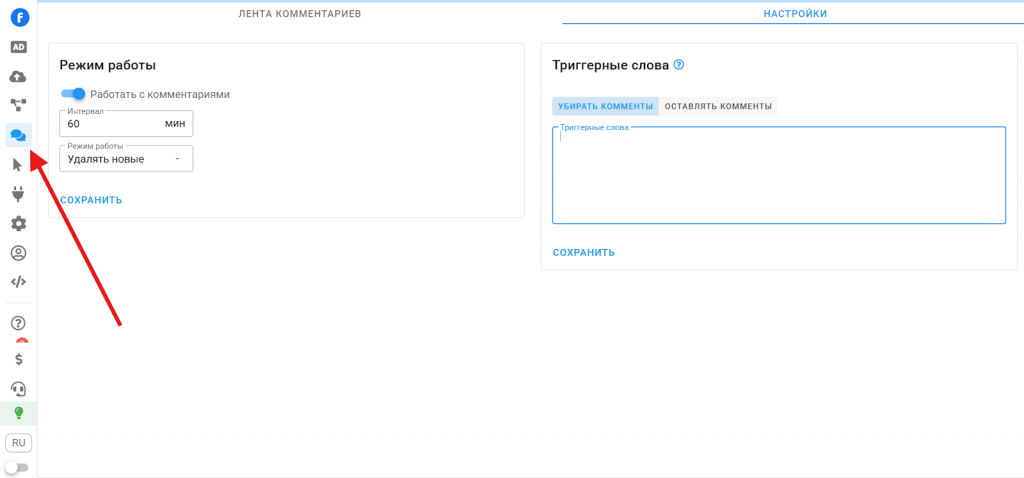 В этом разделе подгружаются комментарии, которые появляются под рекламными постами. И здесь же можно настроить их автоматическую модерацию по триггерным словам.