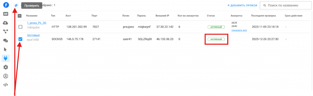 Добавив порт, выделяем его галочкой и жмём «Проверить». Если всё в порядке, его статус изменится на «Активный».