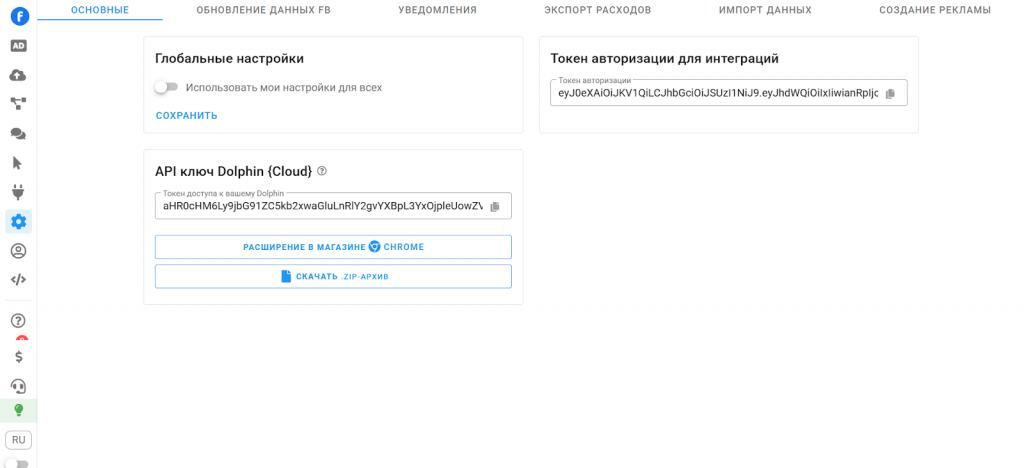 Если вы работаете с Facebook в антидетекте и туда подключены прокси, рекламные кабинеты легко занести в автозалив вместе с их экосистемой. Для этого надо перейти в раздел настроек и скопировать оттуда API-ключ.