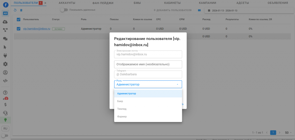 От роли зависят возможности и ограничения каждого участника. После добавления участника, можно ему передавать рекламные кампании, аккаунты, кабинеты, фанки и т.п.