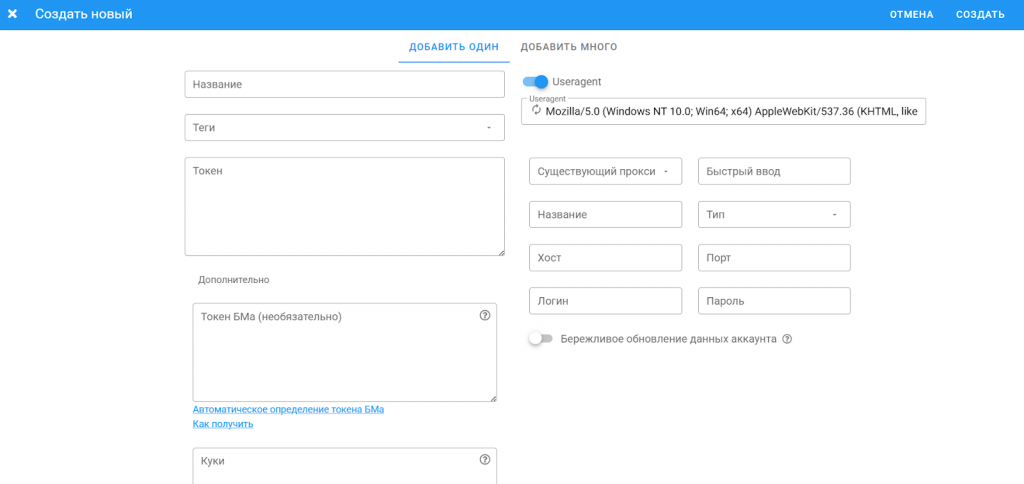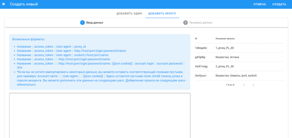Есть возможность добавлять кабинеты массово. Для этого нужно выбрать вкладку «Добавить много», ввести данные аккаунтов и выбрать прокси (либо ввести данные портов прямо рядом с данными кабинетов).