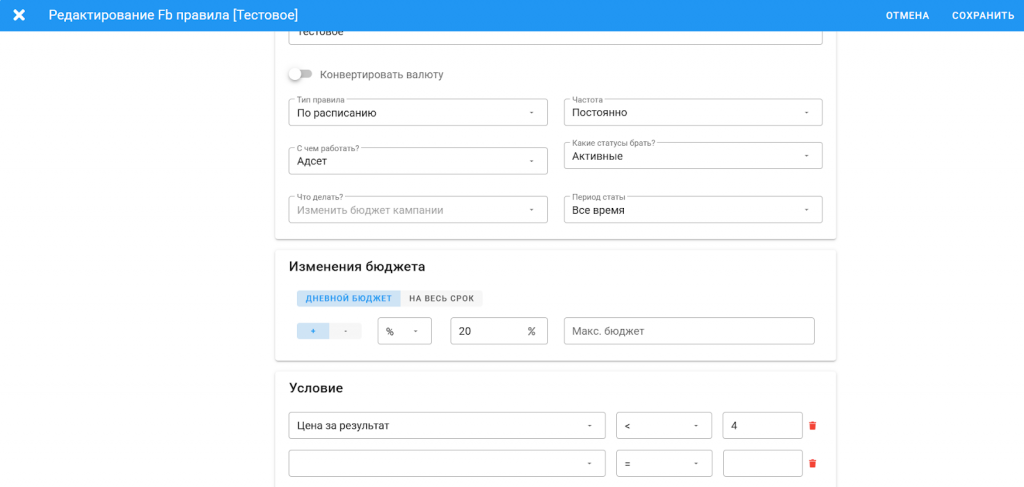 - Условие действия: достижение цены лида, установка приложения, достижение ROAS на сайте или другое.